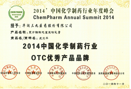 中國化學(xué)制藥行業(yè)年度峰會由中國化學(xué)制藥工業(yè)協(xié)會、中國醫(yī)藥商業(yè)協(xié)會、中國非處方藥物協(xié)會、中國醫(yī)藥企業(yè)發(fā)展促進會、國藥勵展展覽有限責任公司共同主辦,峰會發(fā)布了“2014中國化學(xué)制藥行業(yè)優(yōu)秀企業(yè)和優(yōu)秀產(chǎn)品品牌”。華潤三九皮炎平與輝瑞的鈣爾奇、中美天津史克的芬必得、西安楊森的達克寧等多個產(chǎn)品品牌一起獲得該項榮譽?! 。ㄍ跖d旺)
