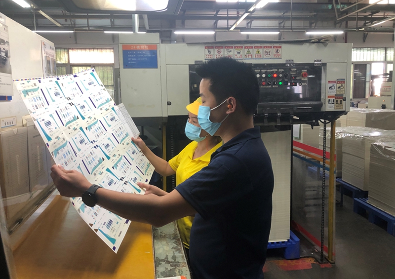 技術(shù)研發(fā)部緊急制作和客戶(hù)確認(rèn)產(chǎn)品文件和生產(chǎn)作業(yè)單,采購(gòu)部協(xié)調(diào)紙張、膠膜、紙箱等物料快速到位,生產(chǎn)系統(tǒng)統(tǒng)籌協(xié)調(diào)規(guī)劃產(chǎn)線。24日晚,前期文件等準(zhǔn)備工作和材料全部到位。25日早8點(diǎn),客戶(hù)到公司車(chē)間機(jī)印刷現(xiàn)場(chǎng)確定顏色,9點(diǎn)半簽樣完成,2臺(tái)印刷機(jī)高速生產(chǎn)。